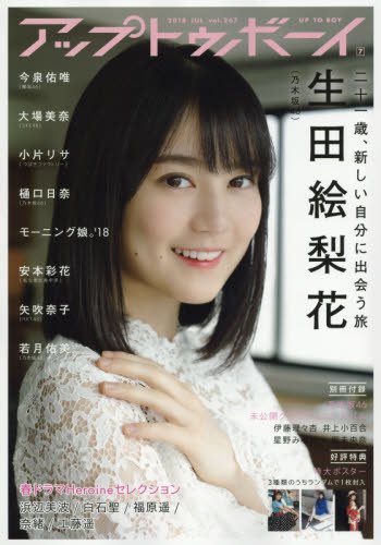 2018-05-26 UP TO BOY(アップトゥボーイ) 2018年7号 Vol.267 立ち読み 雑誌 付録:ミニ写真集/ポスター/ 表紙:生田絵梨花(乃木坂46) 発売日:2018年5月23日(水) 出版社:ワニブックス 価格:¥1,250(税込) Amazon.co.jpの詳細へ 「グラビア」 生田絵梨花(乃木坂46) 樋口日奈(乃木坂46) 今泉佑唯(欅坂46) 大場美奈(SKE48) 矢吹奈子(HKT48) 安本彩花(私立恵比寿中学) モーニング娘。'18 小片リサ(つばきファクトリー) 若月佑美(乃木坂46) 「付録・ミニ写真集」 伊藤理々杏(乃木坂46) 井上小百合(乃木坂46) (星野みなみ/堀未央奈) 「付録・特大ポスター1枚(全3種類)」 Amazon.co.jpの「UP TO BOY(アップトゥボーイ) 2018年7号 Vol.267」の詳細へ